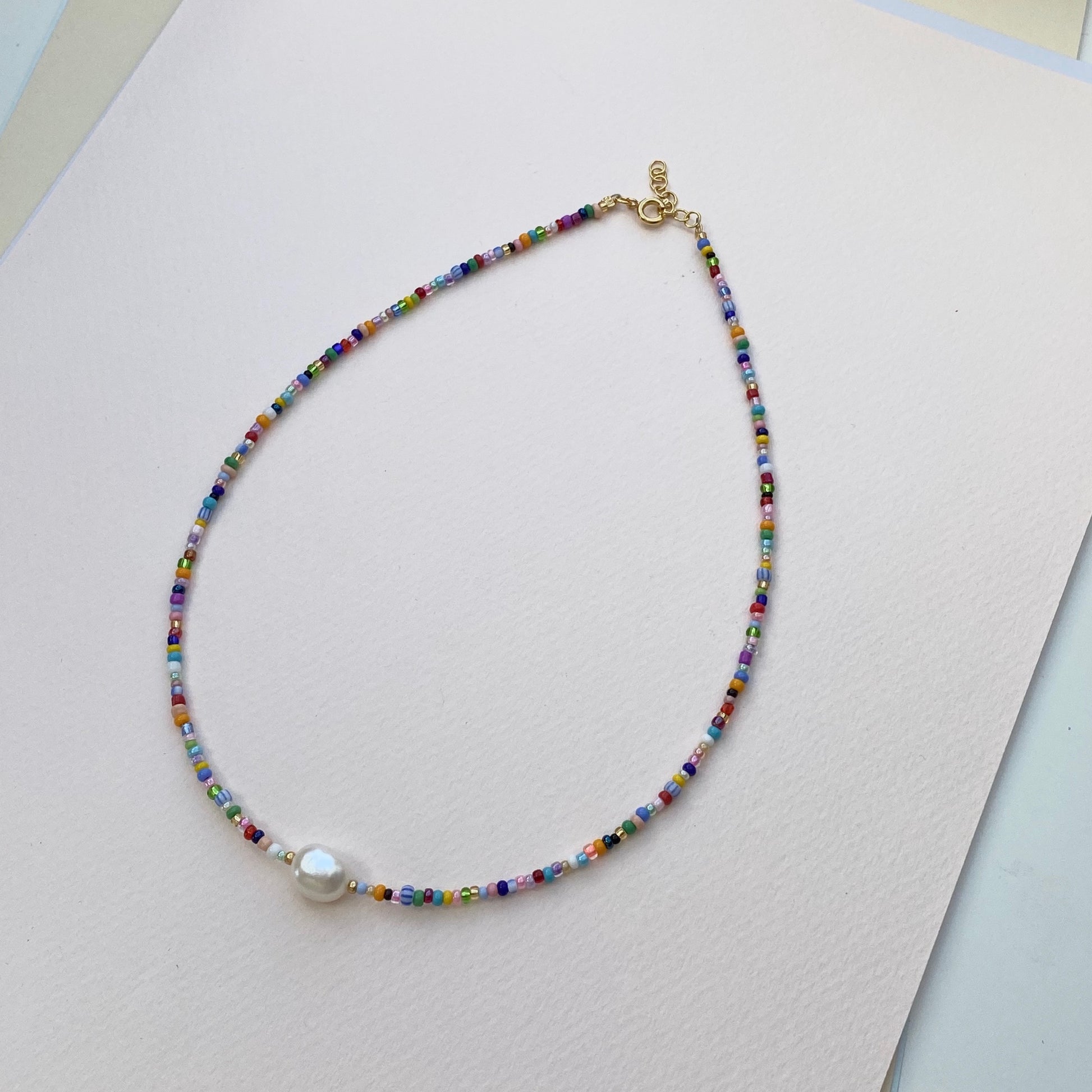 The Favorite necklace is just one of our colorful necklaces made with lots of different colored seed beads plus a real freshwater pearl in the middle. Compared to our "Summer necklace" and "Baroque summer necklace", the Favorite necklace is the necklace with the smallest freshwater pearl.